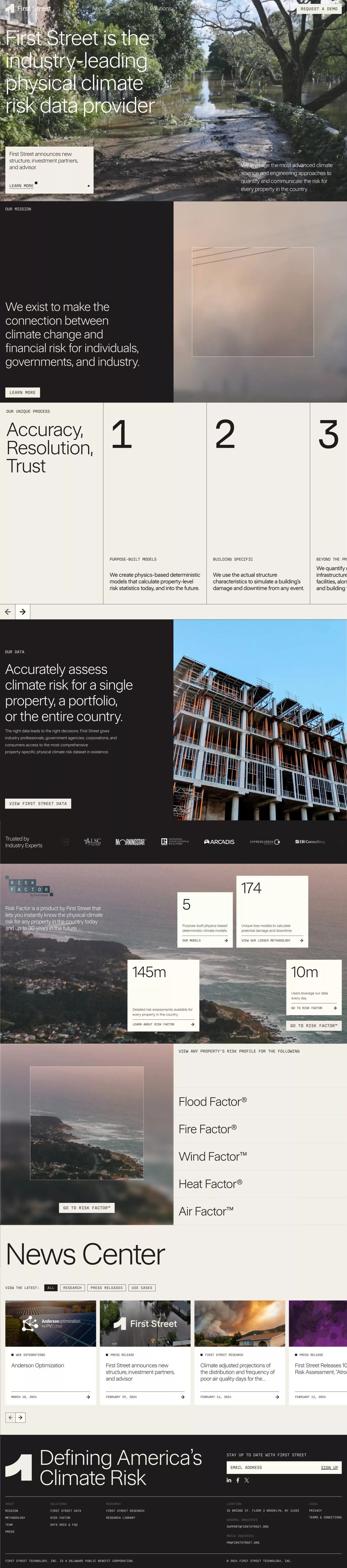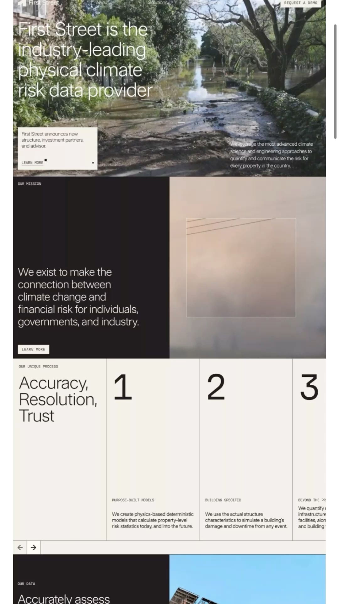 The image presents a clean, professional layout combining large blocks of white space with photographic imagery to convey expertise in climate risk data. The design is modern and corporate, using high-quality visuals alongside clear textual hierarchy to establish authority.