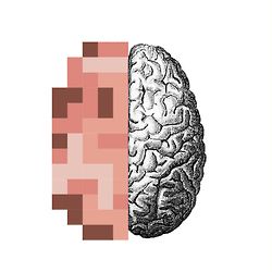 The image presents a stark, abstract juxtaposition between a block of solid color and a detailed anatomical rendering of a brain. The design uses a split composition to imply a relationship or contrast between two distinct elements, creating a modern and somewhat clinical feel.