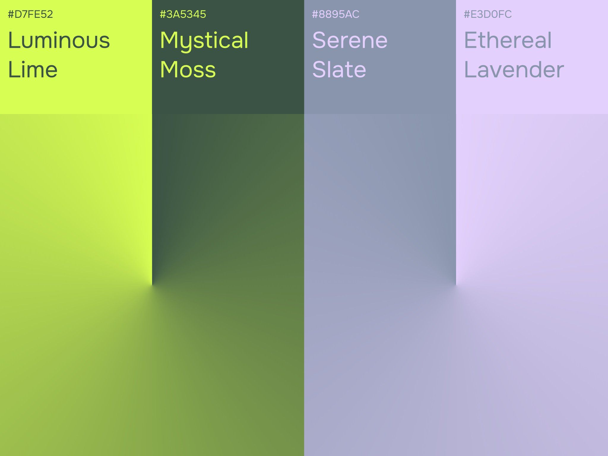 A clean, modern color palette display featuring four distinct vertical color swatches with hex codes and descriptive names. The design uses a minimalist approach with soft gradients and a contemporary aesthetic that emphasizes color harmony and visual balance.
