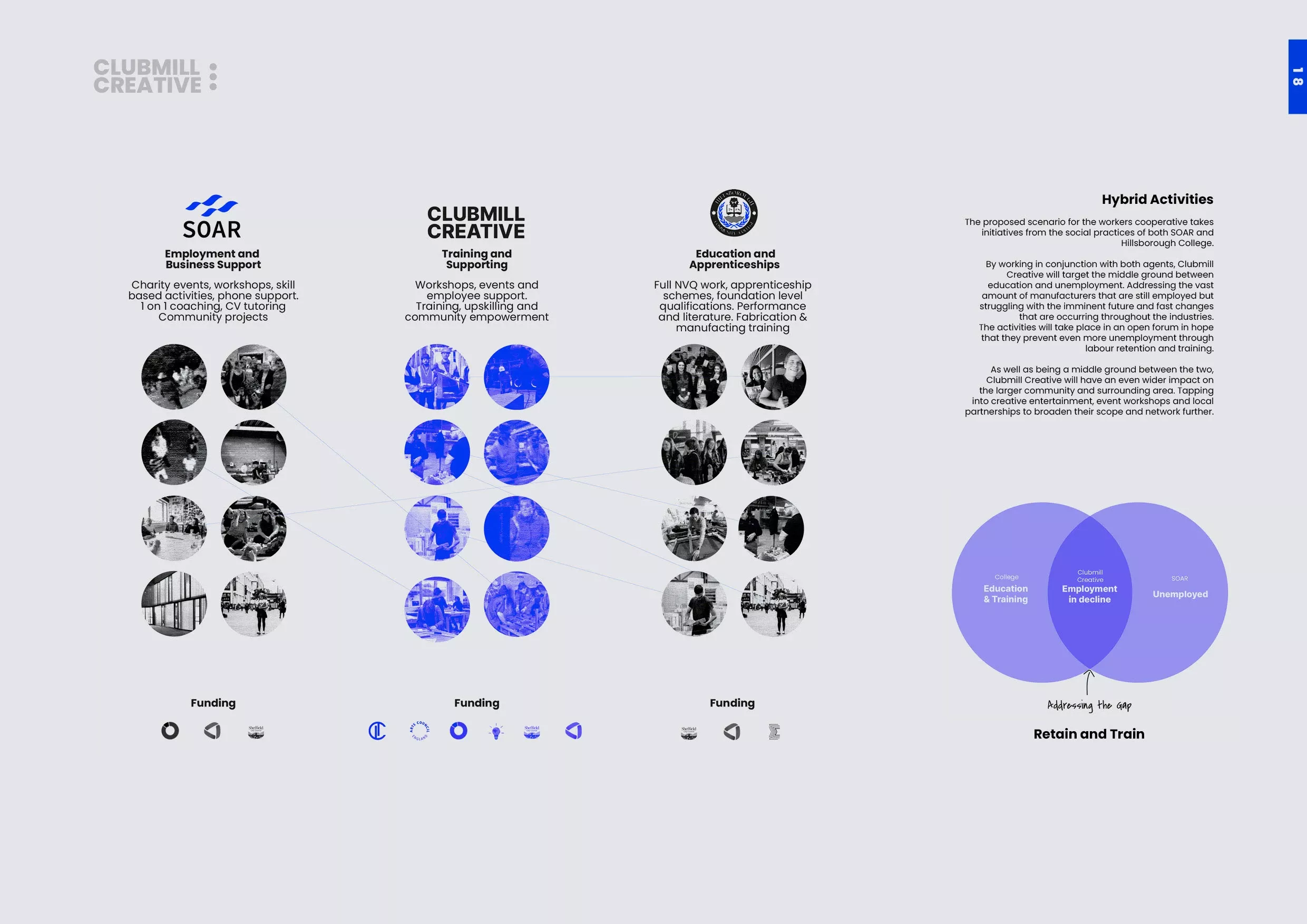 This visual design uses a clean, tripartite layout to present concepts related to social impact and community building. The aesthetic combines photographic elements with geometric accents against a strong, monochromatic green background, creating a balanced and professional feel. The use of portraiture emphasizes human connection and emotional depth.