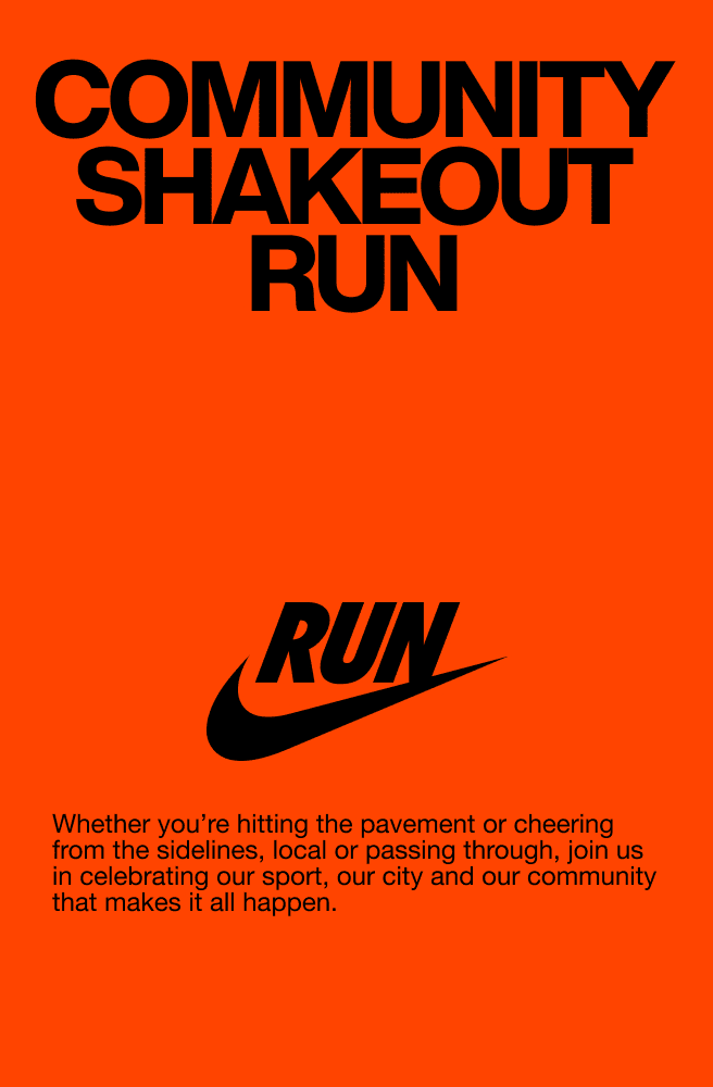 This design utilizes a high-contrast, graphic approach dominated by vibrant orange and stark black typography to convey energy and urgency. The visual language is bold and direct, effectively linking the physical activity of a 'run' with the spirit of community engagement.