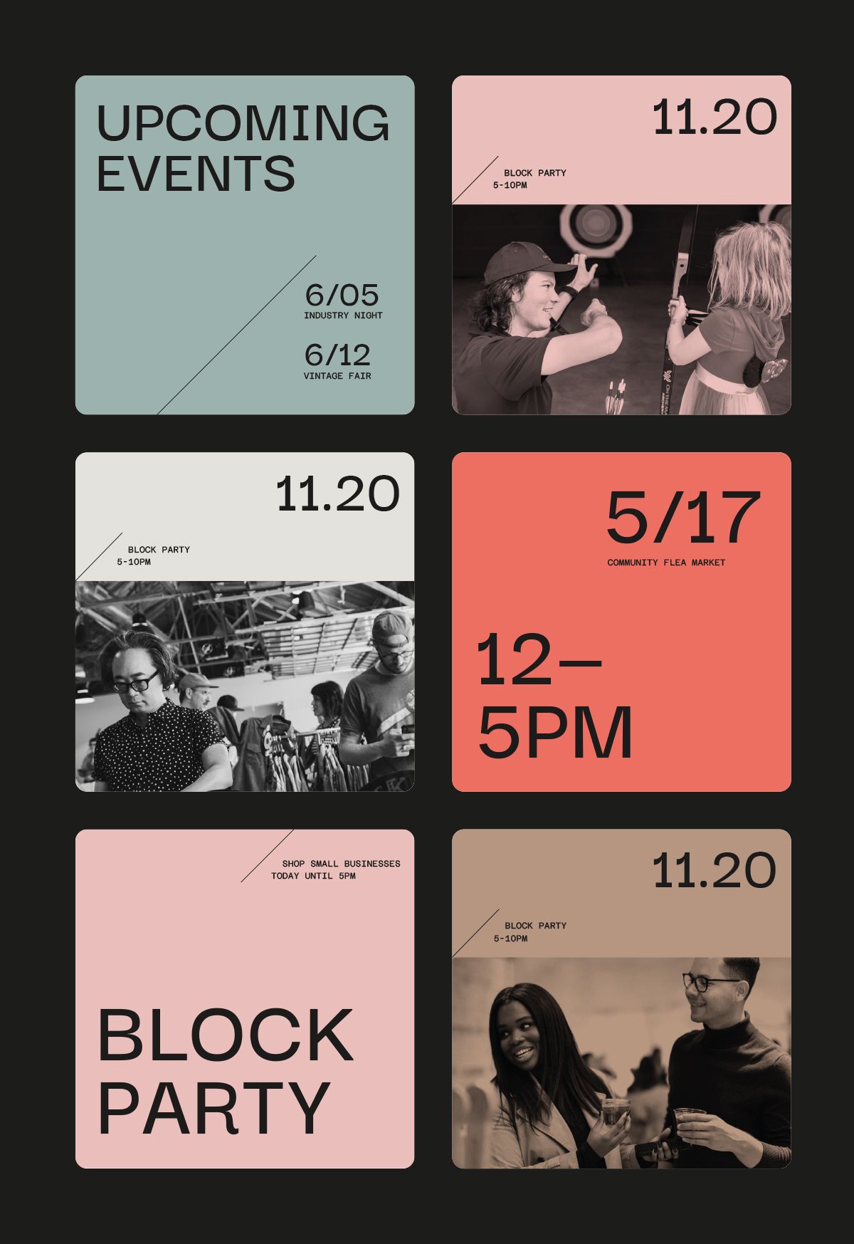 The design utilizes a clean, modern, and minimalist aesthetic with a muted color palette dominated by soft greens, pinks, and warm neutrals. The layout is structured using distinct rectangular blocks to clearly separate upcoming events, creating a sense of organized information.