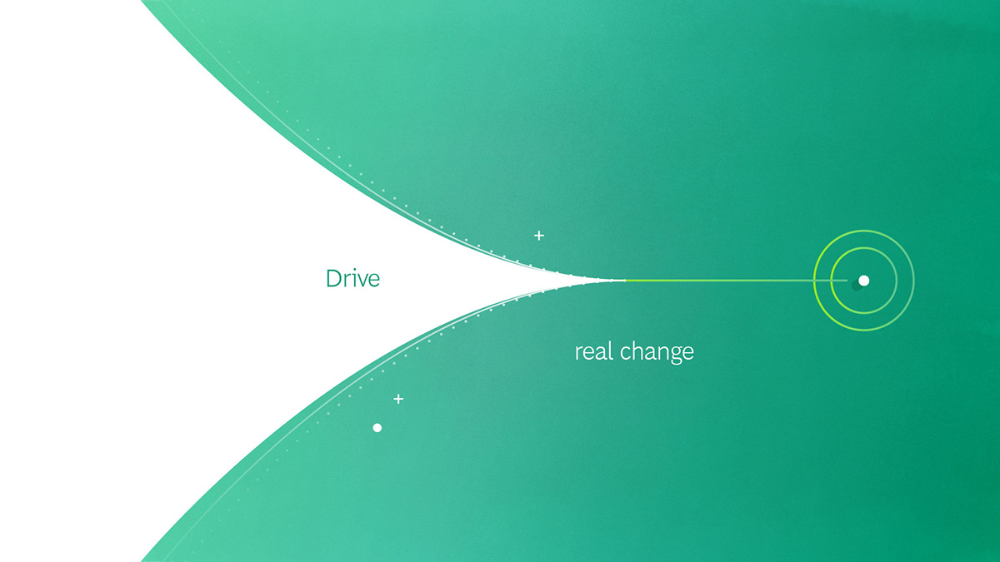 The image features a smooth, organic visual flow where a white shape sweeps across a deep teal background, culminating in a bright green circle. The design uses negative space and subtle gradients to suggest movement and transformation.