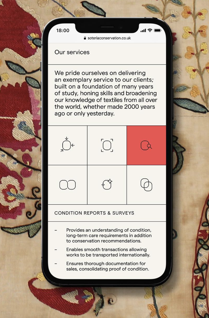 The image presents a clean, professional mobile interface design focused on conveying service information. The layout is highly structured, using white space effectively to separate key features and text, resulting in a modern and trustworthy aesthetic.