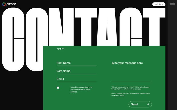 The design is minimalist and modern, utilizing high contrast between white text and a deep, muted green background. It presents a clean, straightforward contact form with ample negative space, conveying professionalism and simplicity.