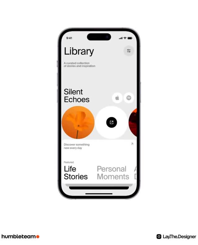 The image displays a clean, modern mobile application screen featuring a library interface with a strong focus on visual hierarchy and minimalist design. The use of organic shapes, like the prominent orange flower illustration, suggests a curated and thoughtful content experience.