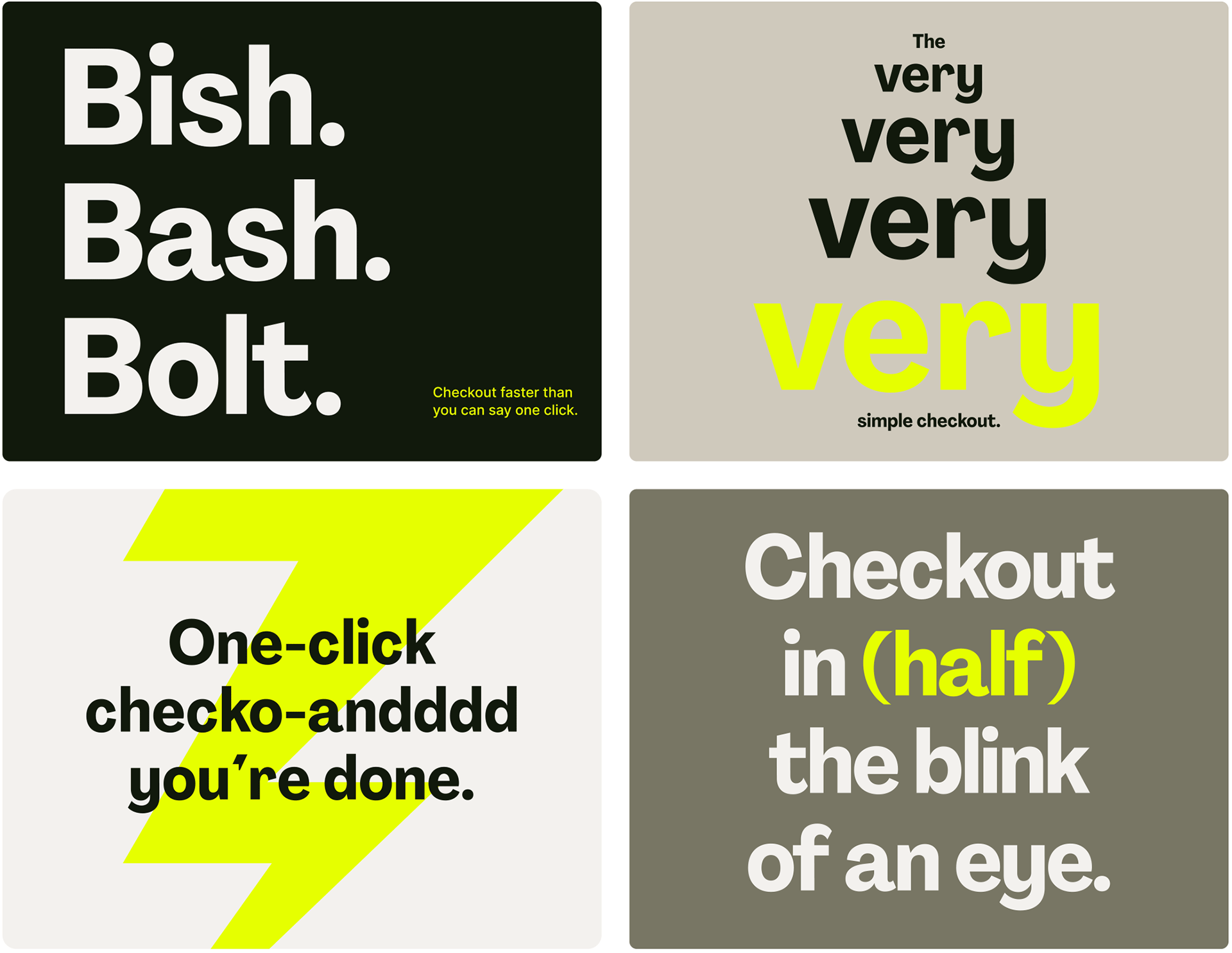 This design utilizes a stark, high-contrast visual language to emphasize speed and simplicity. The layout is clean and modular, employing distinct color blocks—ranging from deep black to soft gray and vibrant lime green—to create visual hierarchy. The overall feel is modern, direct, and focused entirely on communicating a frictionless user experience.