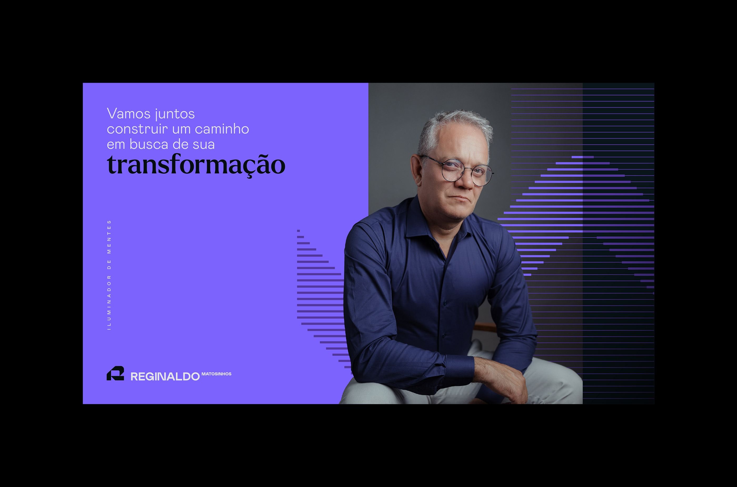 The design features a clean, modern layout dominated by shades of purple and gray, using strong geometric lines to convey a sense of transformation and professionalism. The composition is balanced, placing the subject against a textured, layered background.