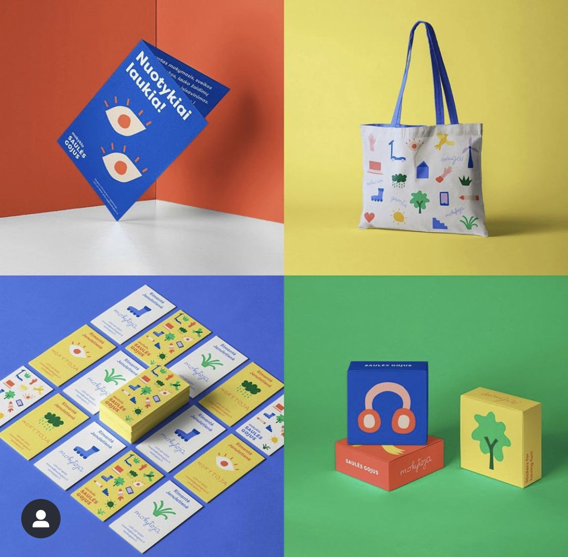The image presents a clean, modern, and playful visual display of branded products, utilizing bold color blocking and simple graphic elements. The design balances vibrant primary and secondary colors with white space to create a sense of organization and approachable charm.