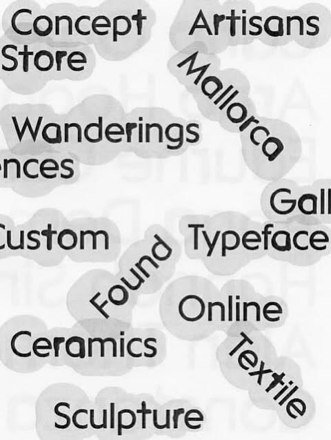 The image presents a collection of loosely grouped, irregularly shaped text labels or tags against a white background. The design is minimalist and relies on simple, sans-serif typography to convey various concepts or products in a casual, perhaps artisanal context.