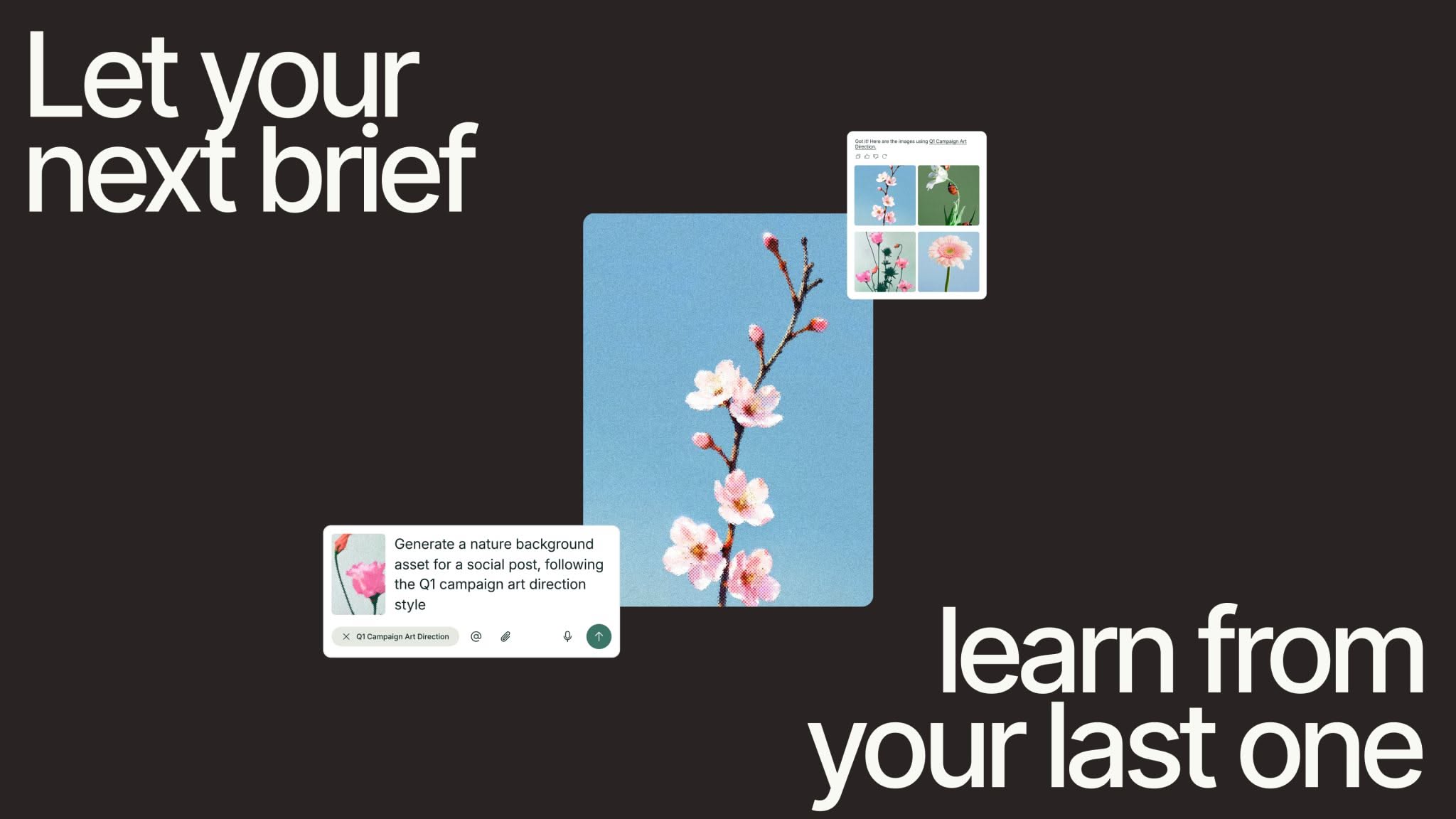 This design features a clean, modern layout utilizing high contrast between dark and light tones. It functions as an instructional or portfolio piece, pairing clear text with stylized nature imagery to promote creative direction and asset generation.
