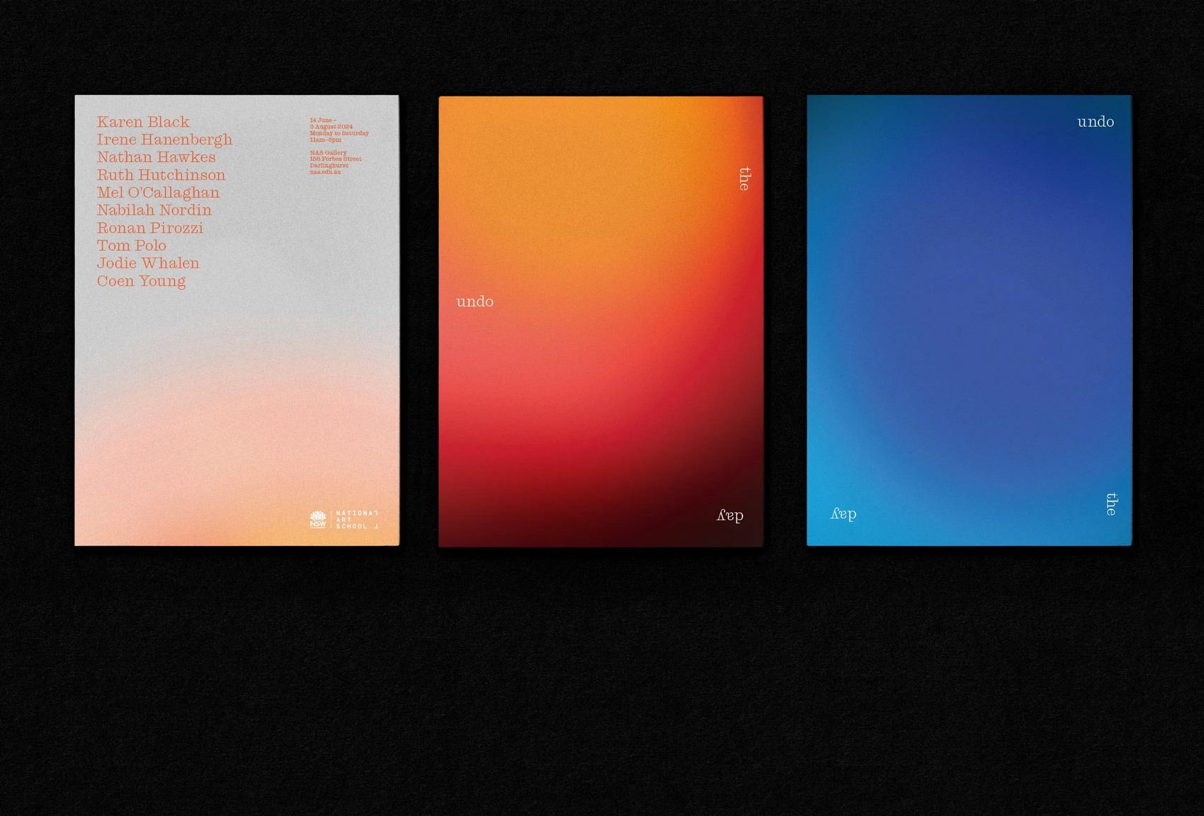 This image presents a minimalist and sophisticated visual display, likely a selection of portfolio entries or project covers. It utilizes a clean, muted color palette with strong gradients to create depth and focus on the text labels.
