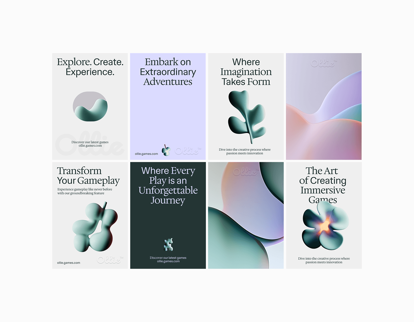 This image presents a clean, modern, and sophisticated grid layout featuring soft, organic shapes against muted pastel backgrounds. The design uses negative space effectively to create a sense of calm and premium quality, suggesting innovation in the gaming or creative technology sector.