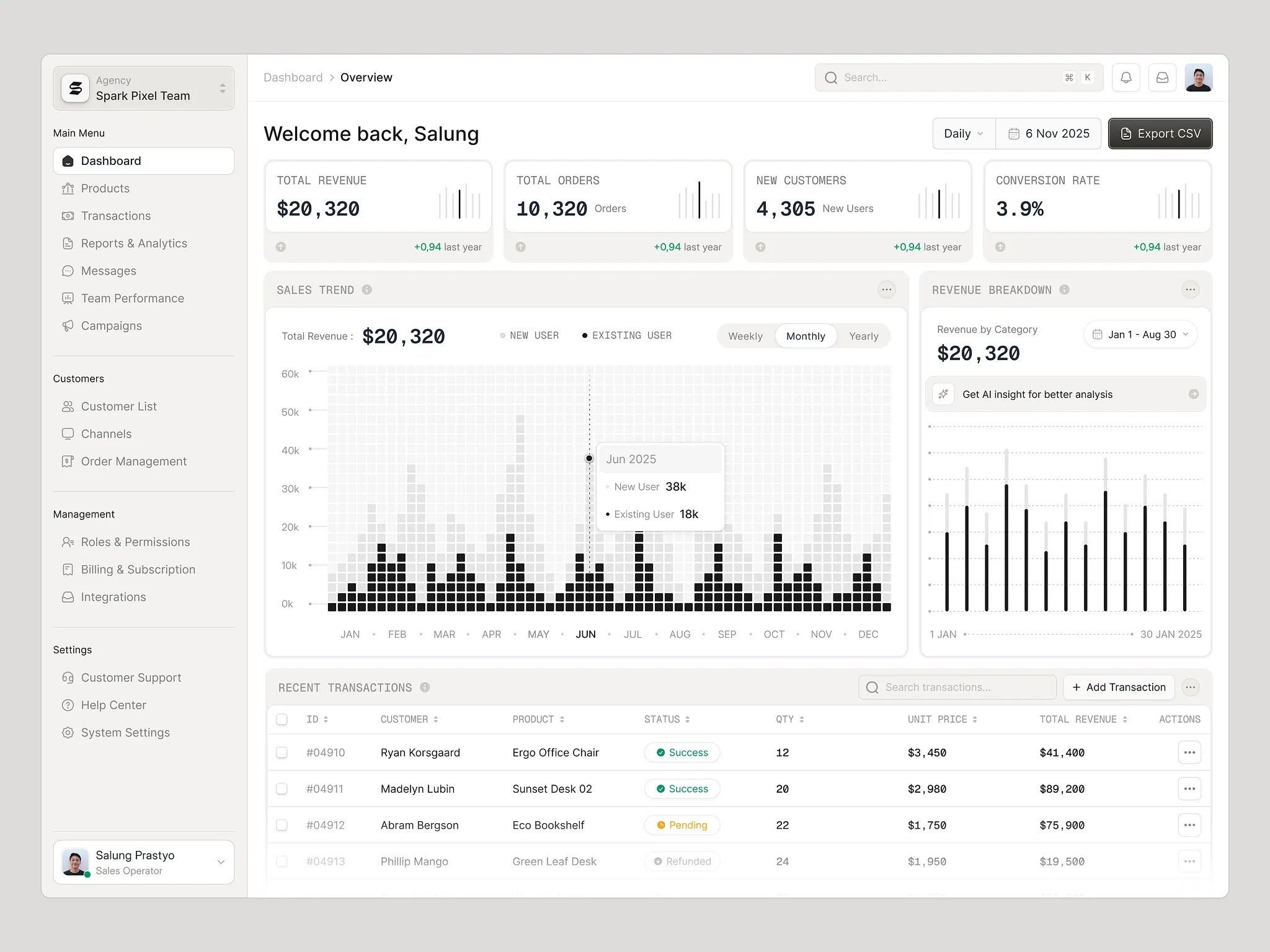 This dashboard features a clean, modern analytical design focused entirely on presenting key business metrics and trends. The visual language relies heavily on clear segmentation, legible typography, and sharp data visualization to provide immediate insights.