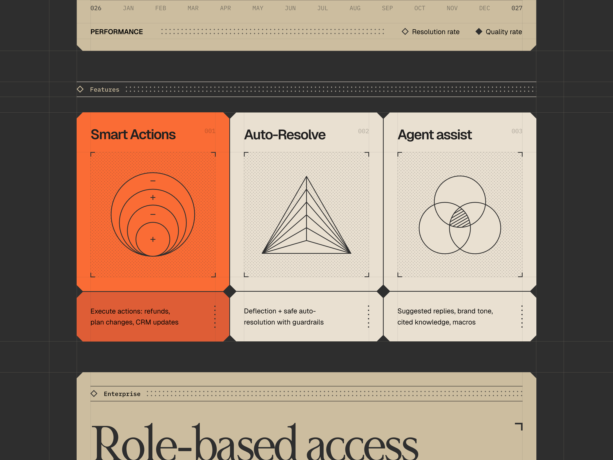 The interface presents a clean, modern dashboard design utilizing a dark background contrasted with bright orange accents to highlight key features. The layout is structured using distinct cards for different functionalities, suggesting a professional and data-driven application.