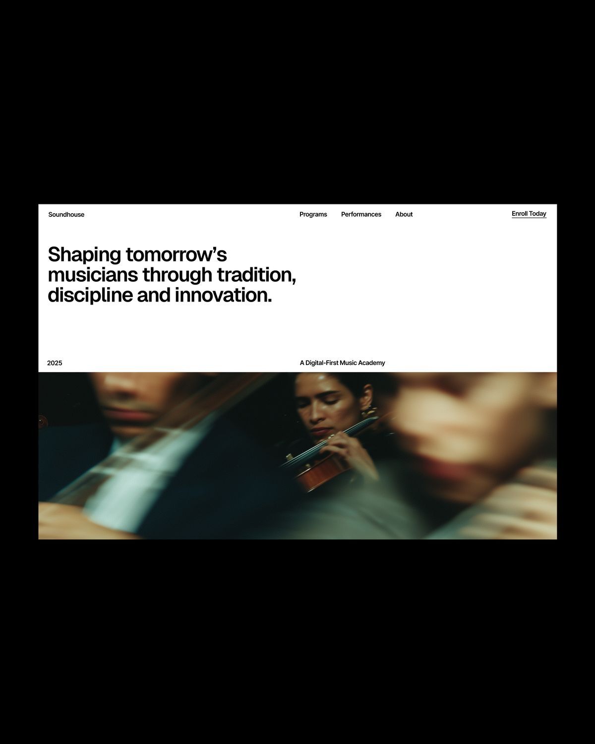 This slide employs a high-contrast, cinematic visual language dominated by deep shadows and soft focus to create an atmosphere of serious artistic dedication. The design effectively links the concept of musical performance and traditional discipline with a forward-looking message about innovation. The overall feel is polished, sophisticated, and deeply focused.