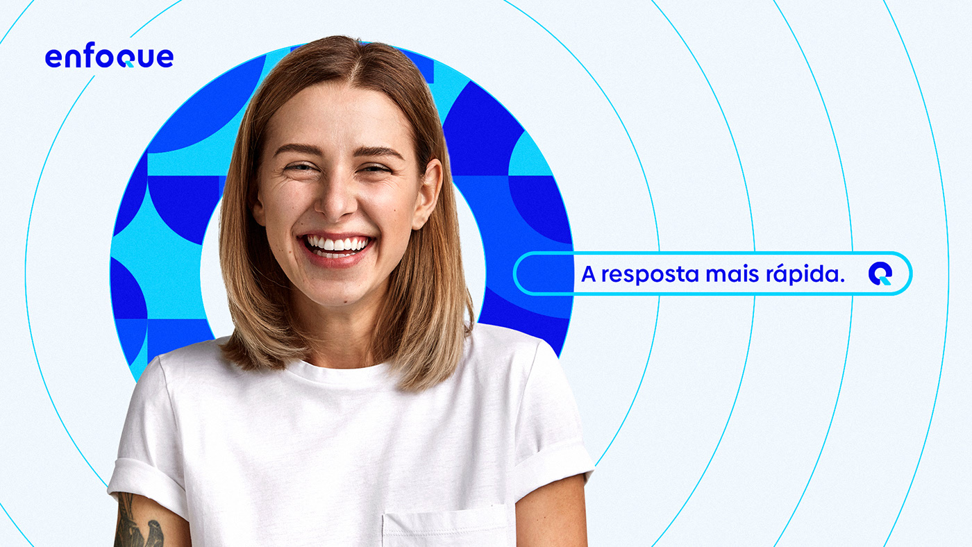 The image features a bright, professional portrait of a smiling woman set against a clean, light blue background with concentric circular graphic elements. The design is modern and inviting, using simple shapes to draw attention to the subject and a call-to-action text overlay.