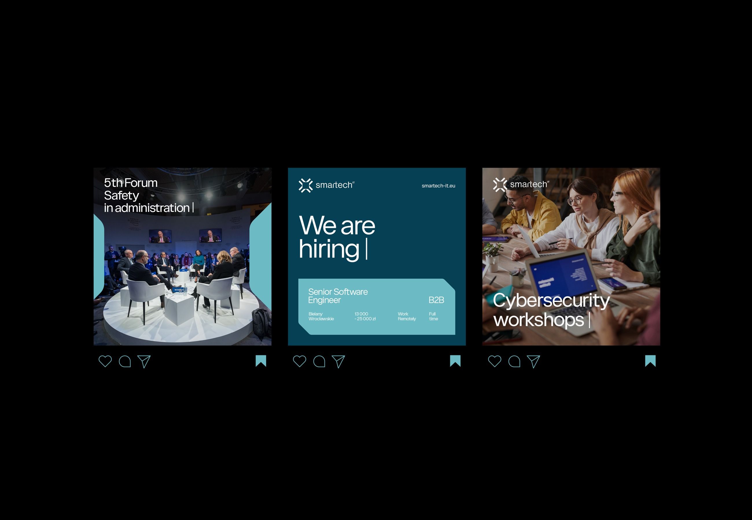 This is a clean, modern presentation layout utilizing a dark aesthetic with bright accents to convey professionalism and trust. The design is modular, effectively segmenting three distinct topics—safety forums, recruitment, and cybersecurity workshops—into clear visual modules.