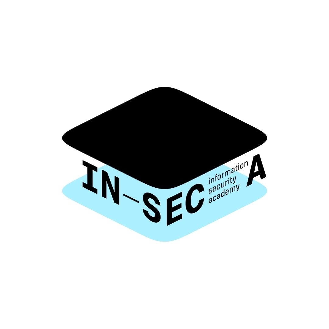The logo features a simple, solid black graduation cap shape overlaid with a light blue banner containing the text 'IN-SEC academy'. The design is clean, modern, and uses negative space effectively to convey a sense of education and security.