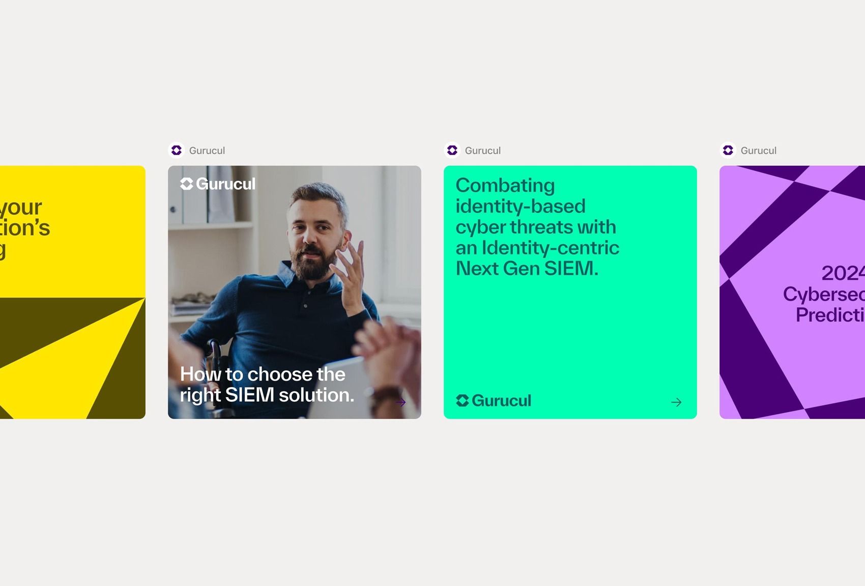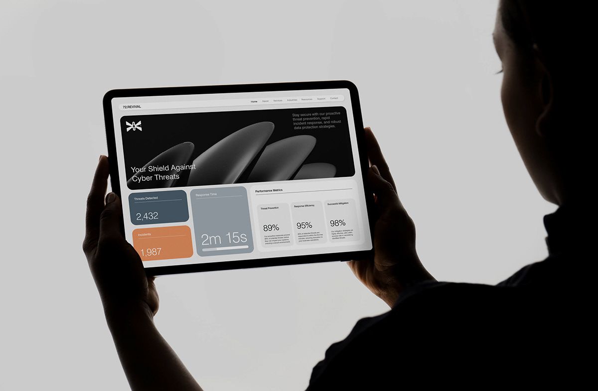 The image presents a clean, modern presentation style typical of a pitch deck or marketing slide, using bold blocks of color and professional photography to convey expertise in cybersecurity. The design is structured horizontally with distinct content cards, aiming for a professional and informative feel.