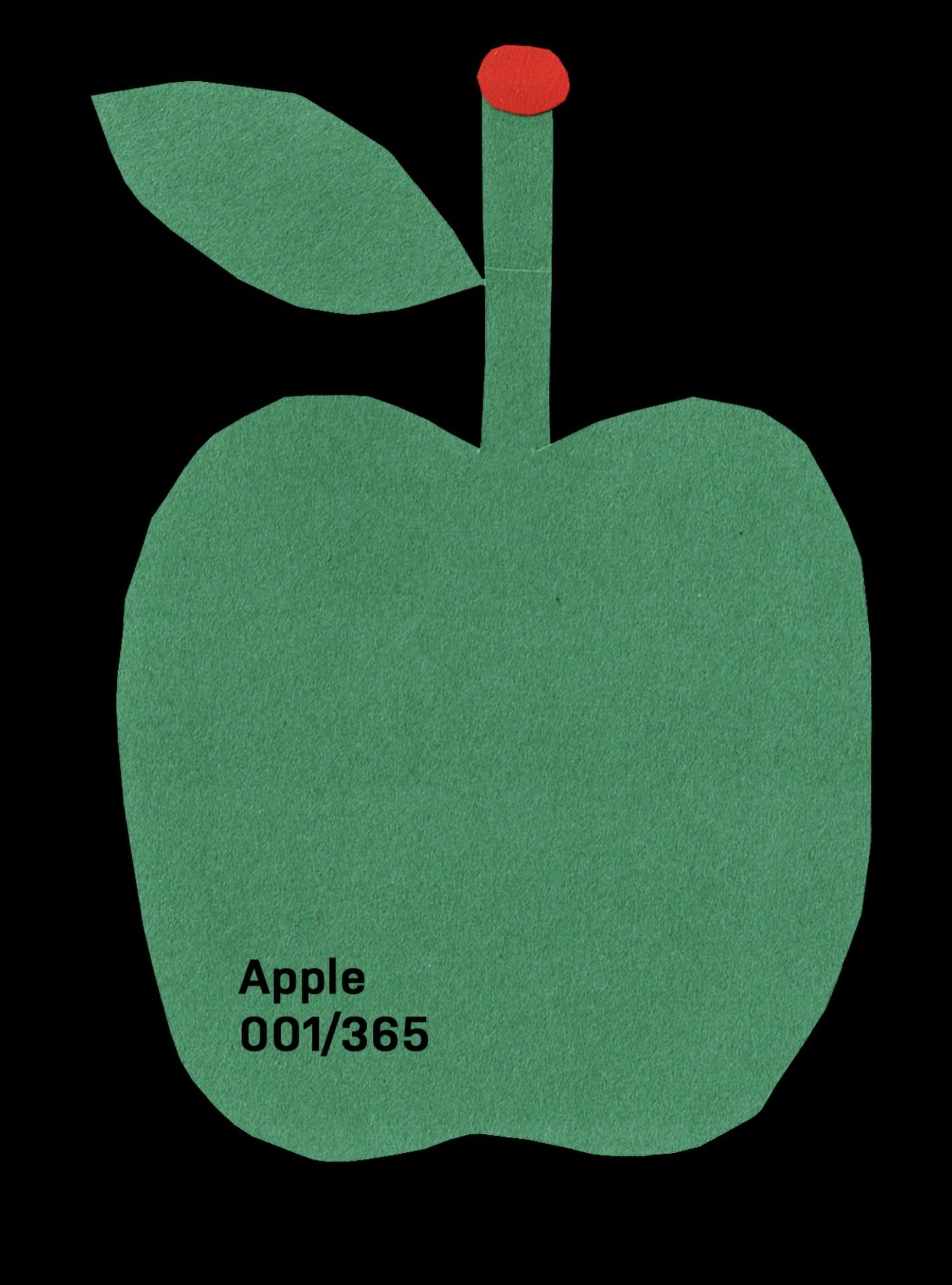 A minimalist illustration of an apple rendered in muted green with a red stem and leaf, set against a stark black background. The design employs bold geometric simplification and a numbered counter (001/365), suggesting a daily project or series. The aesthetic is clean, modern, and deliberately understated with a textured, slightly grainy surface quality.