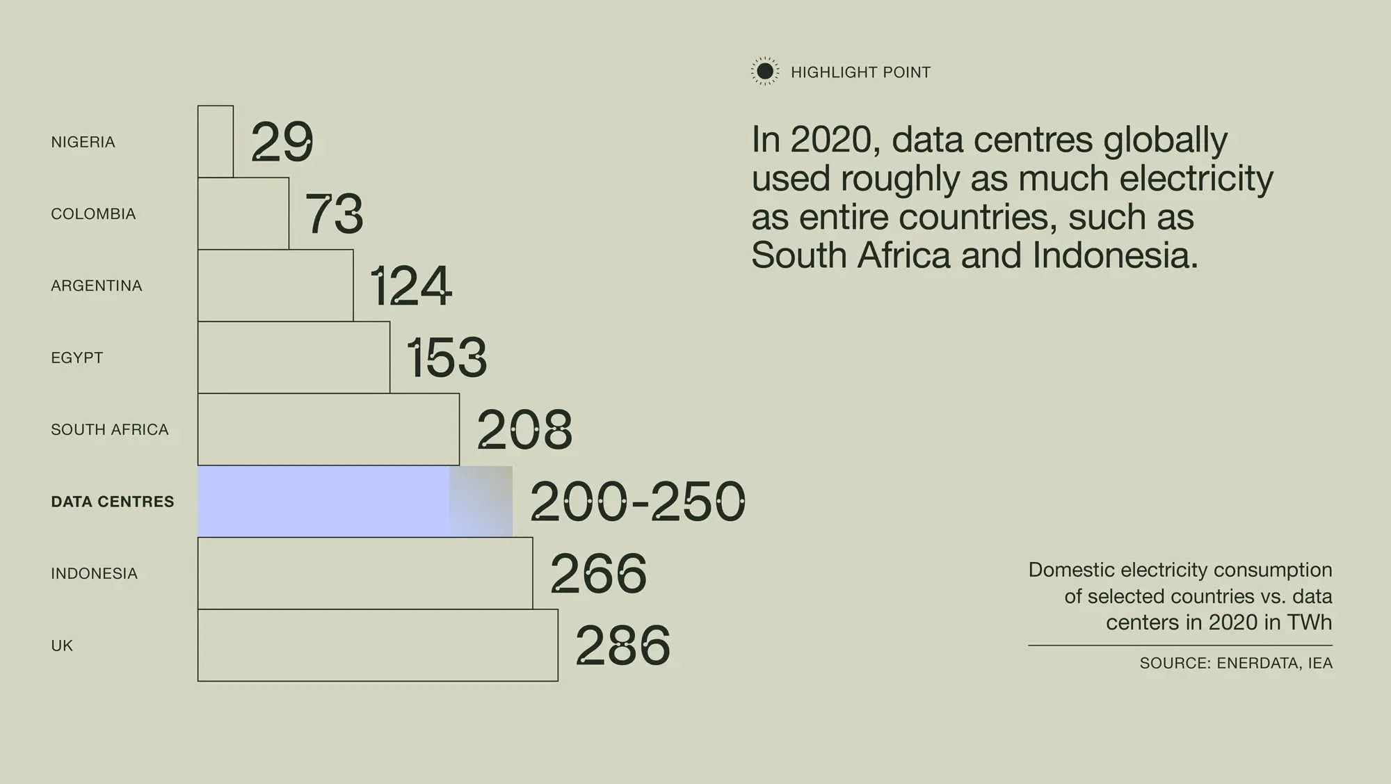 The image is a data visualization, likely a bar chart or stacked bar representation, presenting comparative energy consumption data for data centres across different countries. The design is clean, minimalist, and relies heavily on simple geometric shapes and clear textual labels to convey quantitative information.