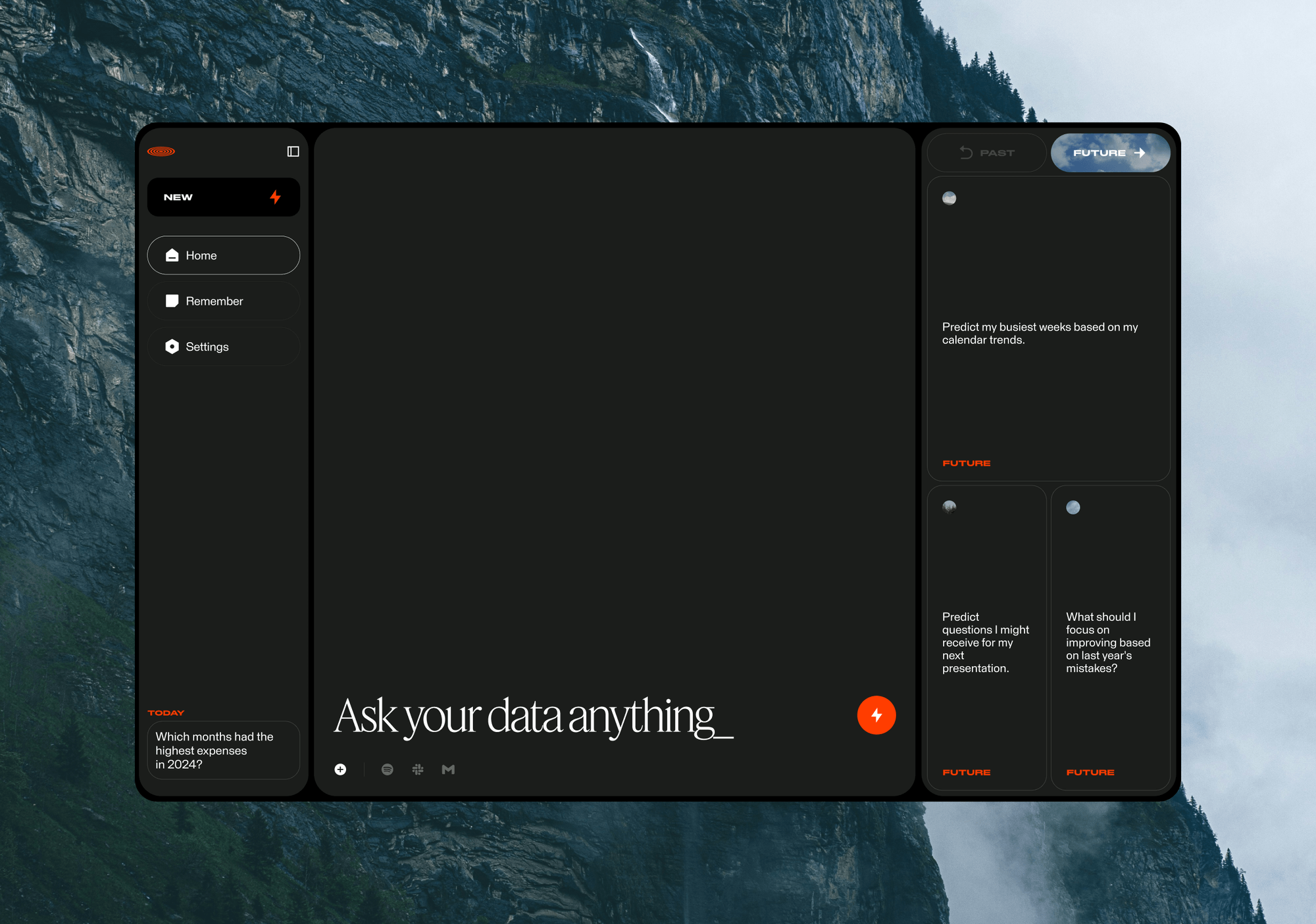 The interface presents a dark mode design with a clean, modern aesthetic, utilizing ample negative space and subtle gradients to convey professionalism and depth. The layout is structured with a sidebar navigation on the left and a main content area, suggesting a sophisticated data or productivity application.