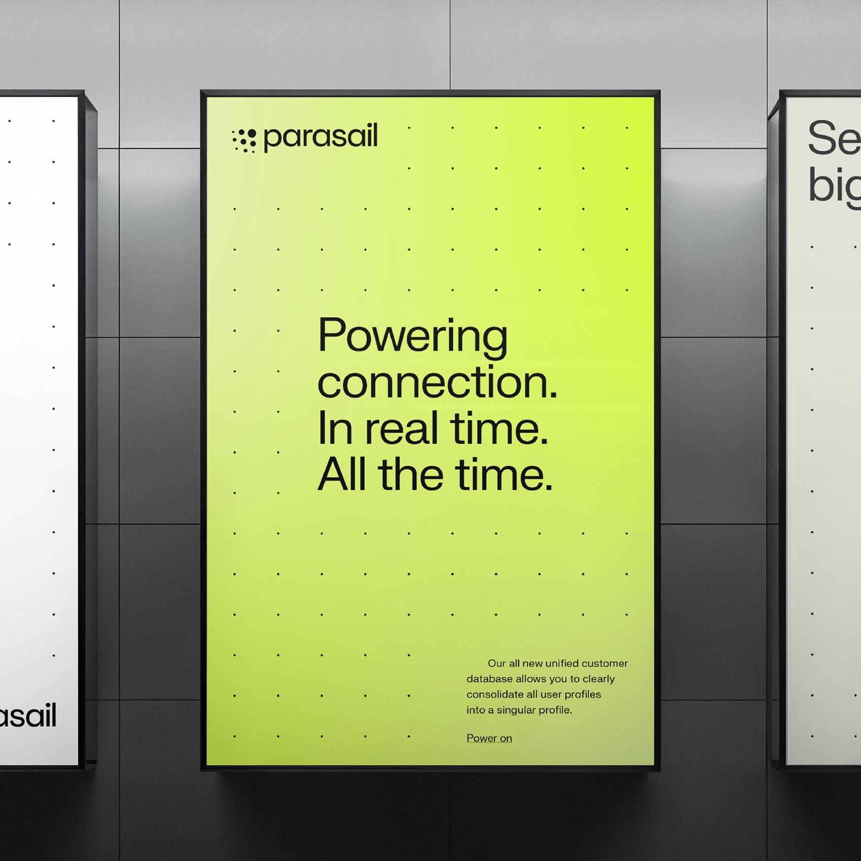 This design utilizes a high-contrast, minimalist approach, pairing a vibrant lime green element against a subdued dark gray background to emphasize clarity and modernity. The visual language is clean and corporate, focusing attention directly on the key value proposition through centered text.