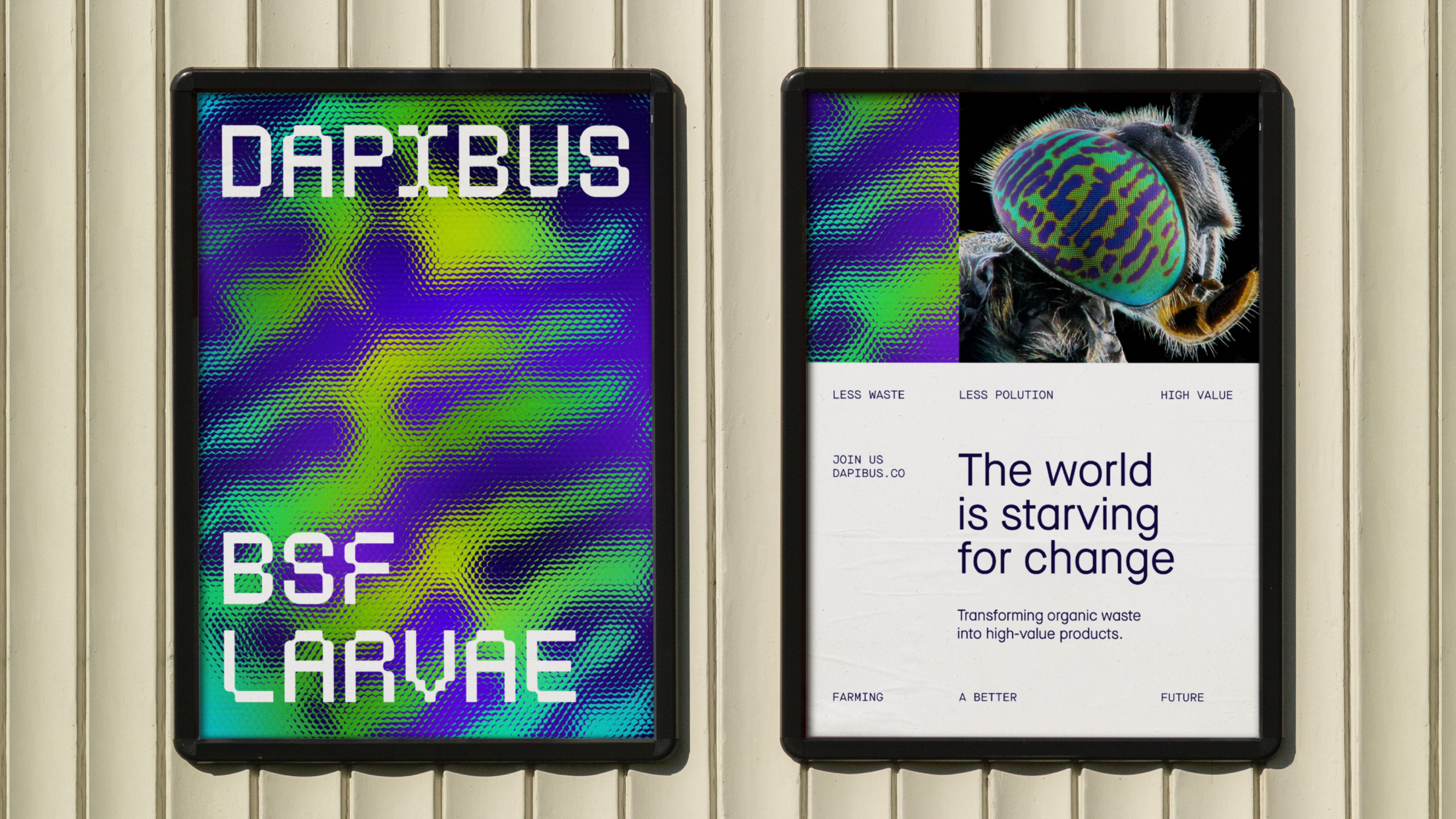 The image presents a stark, high-contrast digital interface design characterized by vibrant, neon-like patterns against dark backgrounds. The visual language is modern and technical, utilizing bold typography to convey specific concepts related to a project or initiative.