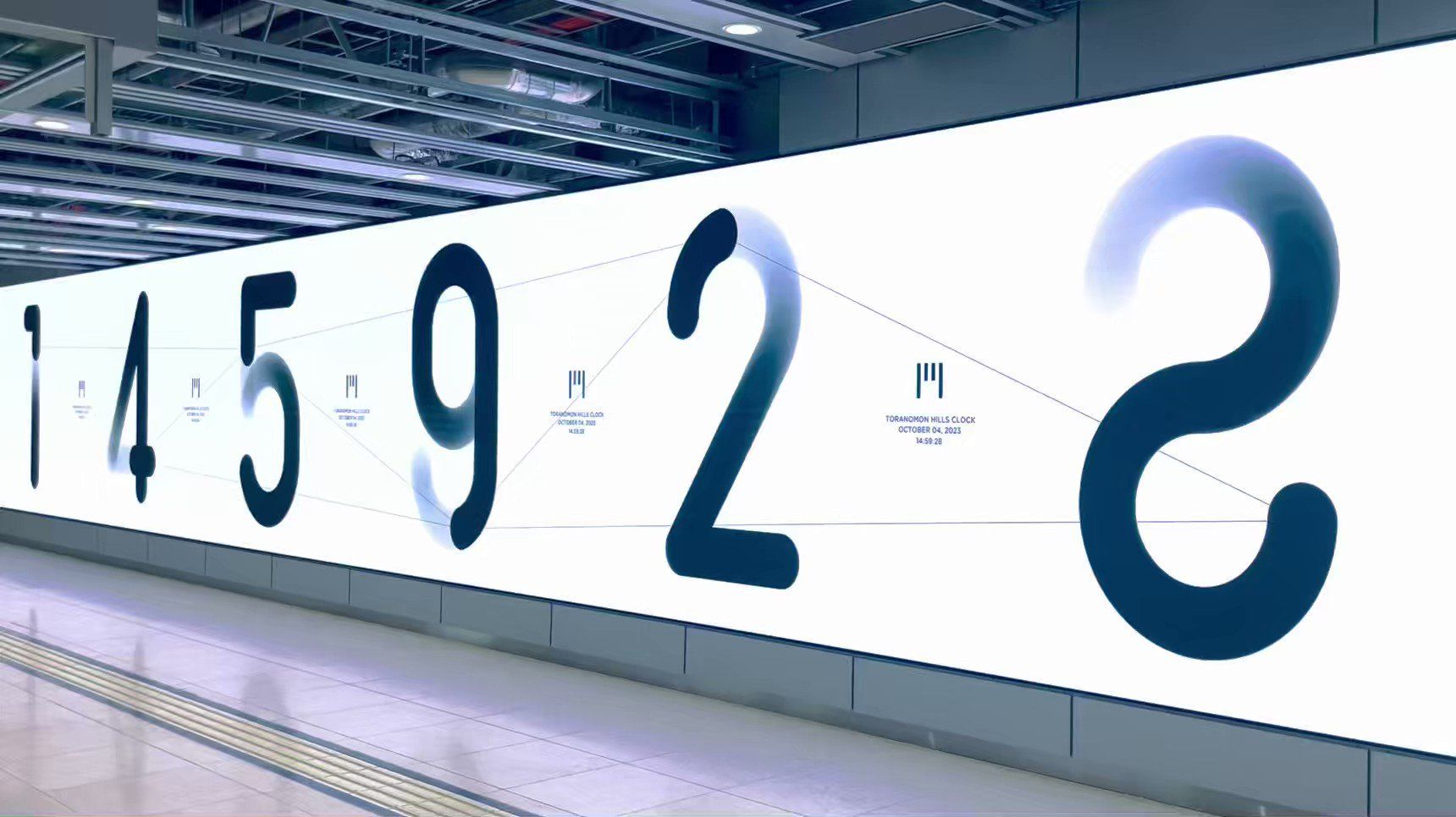This design features a large-scale, minimalist data visualization utilizing custom, flowing typography to display a numerical sequence. The visual language emphasizes clean lines and negative space, creating an elegant and modern presentation of information.