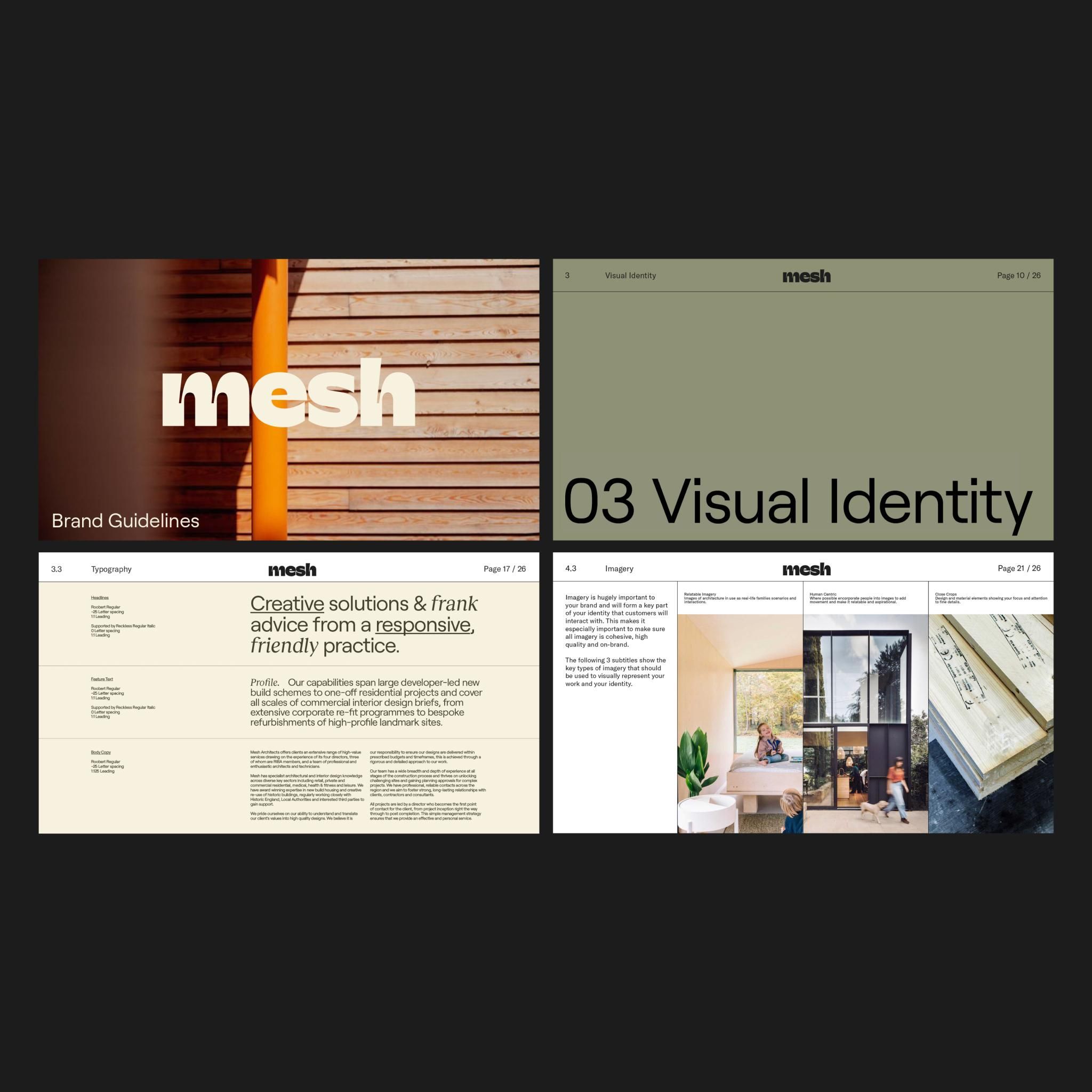 The image presents a clean, modern, and professional visual identity, likely for a consulting or design firm. It uses a muted, earthy color palette contrasted with deep greens and warm oranges/browns to convey stability and environmental focus. The layout is structured into distinct, equally weighted modules.