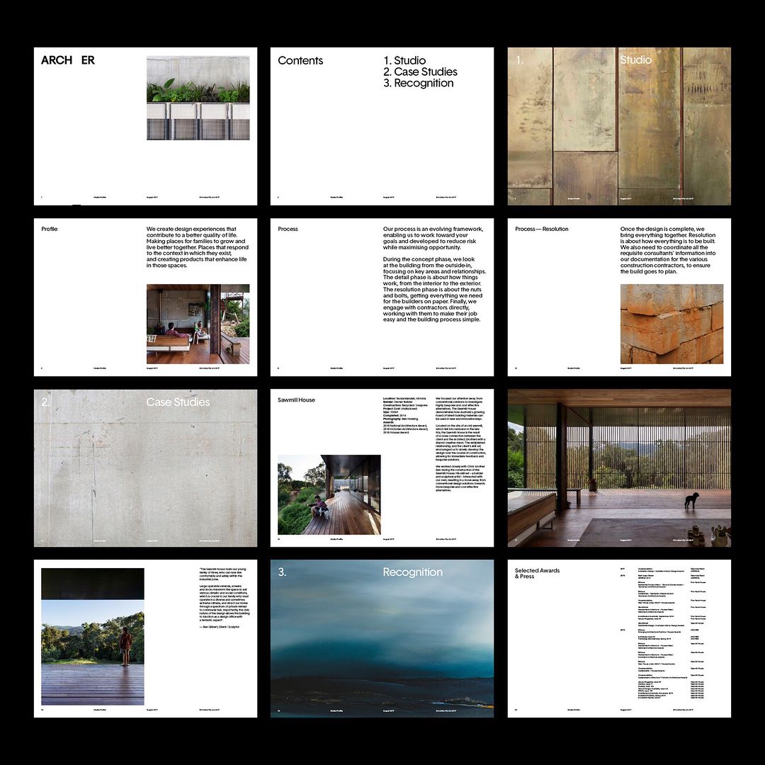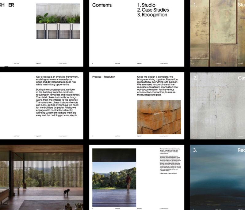 A sophisticated architectural portfolio or design monograph featuring a grid-based layout with minimalist typography and high-quality photography. The design employs generous whitespace, clean typography, and a curated selection of architectural imagery to convey professionalism and refined taste. The overall aesthetic is contemporary and editorial, emphasizing content hierarchy through spatial relationships.