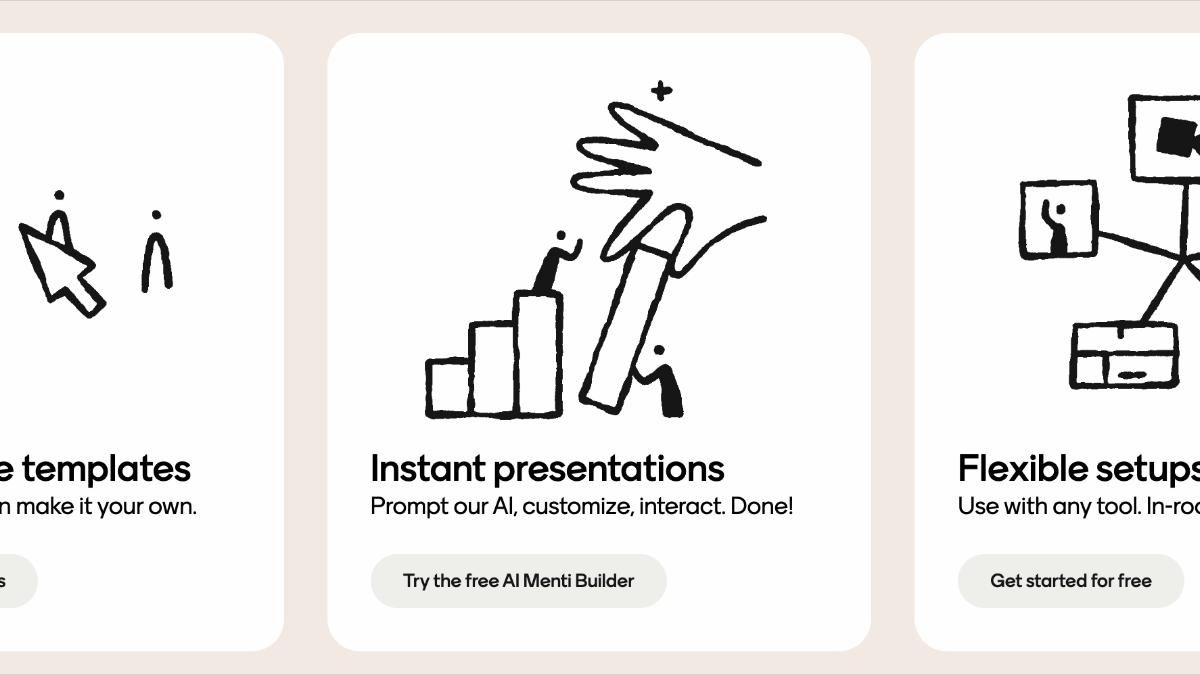 The design features a clean, minimalist aesthetic relying heavily on simple black line art to symbolize concepts related to templates, instant presentations, and flexible setups. The visual language is friendly yet professional, emphasizing ease of use and AI integration through clear iconography.
