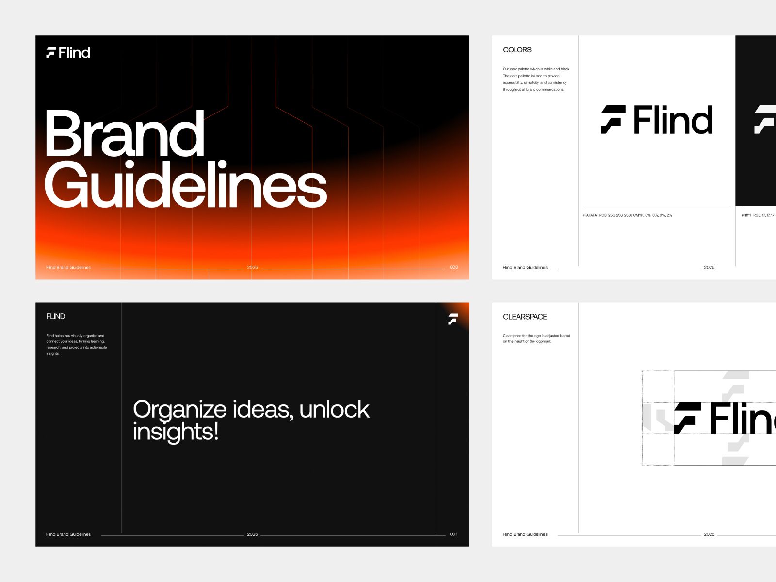 This image presents a clean, structured set of design guidelines and branding examples, utilizing a clear hierarchy to present information. The visual language is minimalist and functional, emphasizing organization and the systematic application of color and typography.