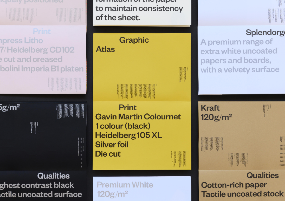 This image functions as a highly organized catalog or specification sheet, presenting various material options with clear technical details. The design is minimalist and structured, relying on clean typography and a muted color palette to emphasize the quality and tactile nature of the materials being offered.