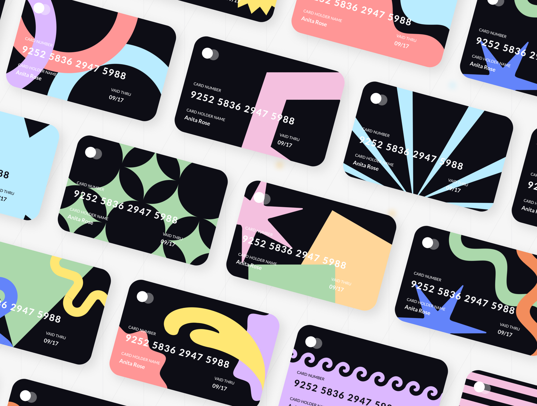 The image displays a collection of modern, minimalist cards or identification badges featuring abstract, colorful geometric shapes and clean typography. The design emphasizes a contemporary, professional, and slightly playful aesthetic through the use of vibrant accents against dark backgrounds.
