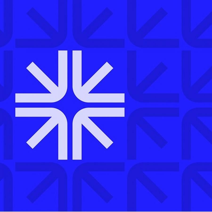 This design utilizes a strong geometric grid structure overlaid with a central abstract motif, creating a clean and highly structured aesthetic. The visual language relies on high contrast between the deep blue background and the bright white foreground to establish clarity and modern simplicity.