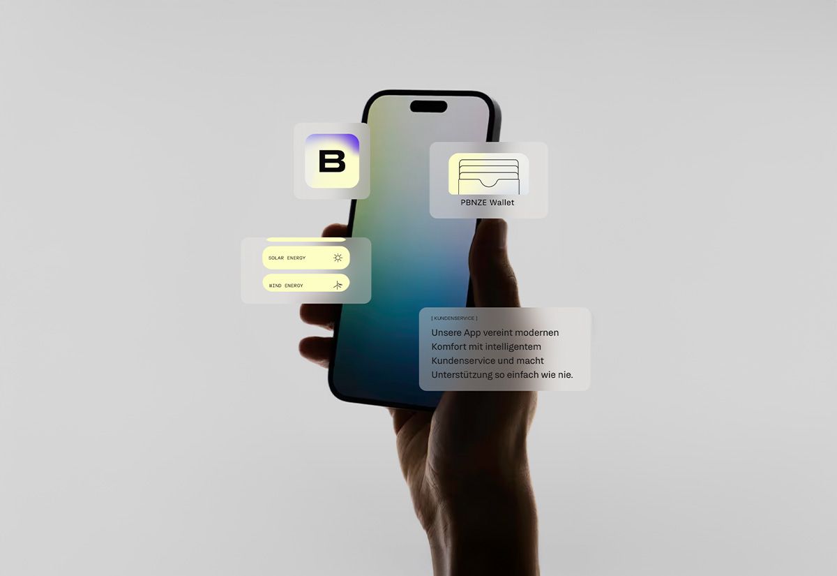 The image features a close-up shot of a hand holding a smartphone, overlaid with semi-transparent, stylized informational boxes. The design is clean and modern, using soft gradients and white/light backgrounds to highlight specific features or concepts related to a digital wallet application.