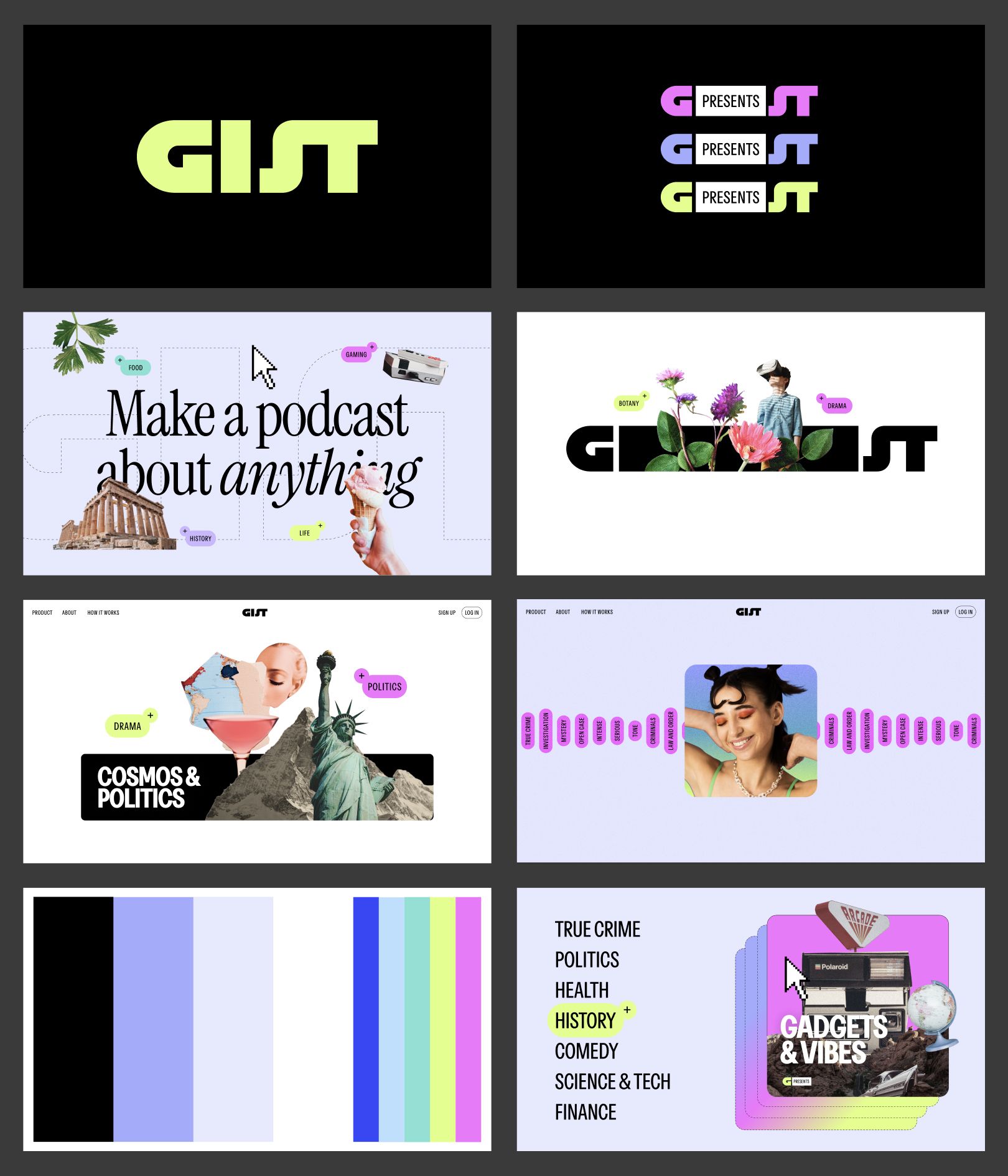 The image displays a grid of promotional or branding mockups, characterized by a clean, modern, and minimalist aesthetic. The design relies heavily on strong typography, simple geometric shapes, and high contrast to convey a sense of contemporary digital content.