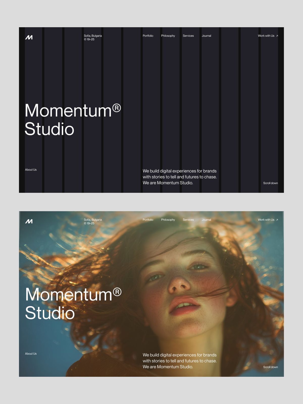 A modern, minimalist portfolio website design for Momentum Studio featuring a clean dark interface with bold typography and striking imagery. The layout emphasizes digital sophistication through generous whitespace, refined navigation, and a sophisticated color palette that transitions between dark and warm tones.