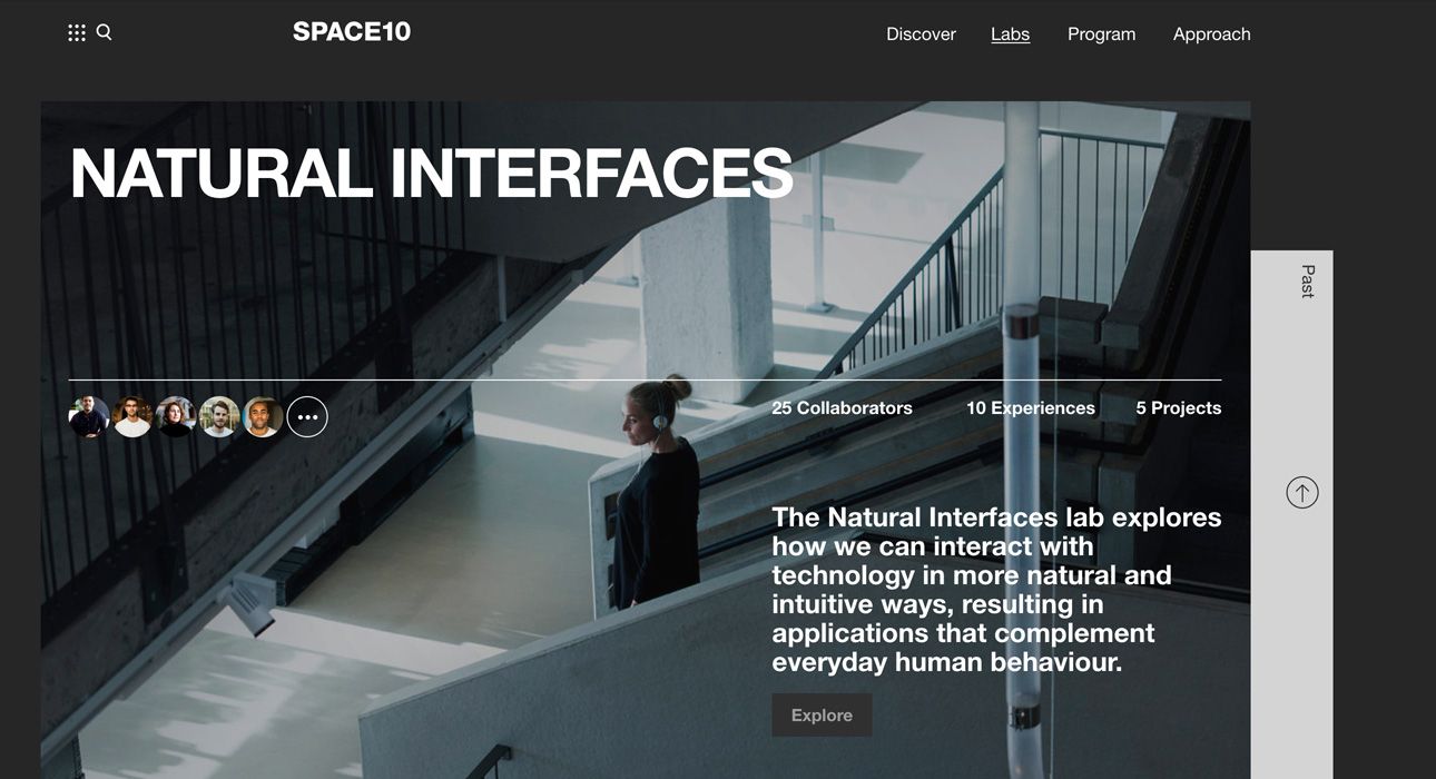 A modern, minimalist web interface showcasing a research lab or design studio called SPACE10, featuring a striking hero image of a person in an architectural space. The design employs a clean, contemporary aesthetic with bold typography and a sophisticated dark theme that emphasizes the photographic content and creates a premium, professional atmosphere.