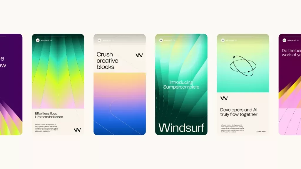 A modern design system showcase featuring five card-based layouts with vibrant gradient backgrounds and minimalist typography. The collection demonstrates contemporary digital design principles with smooth color transitions, clean spacing, and a cohesive visual language centered around tech and creative industries.