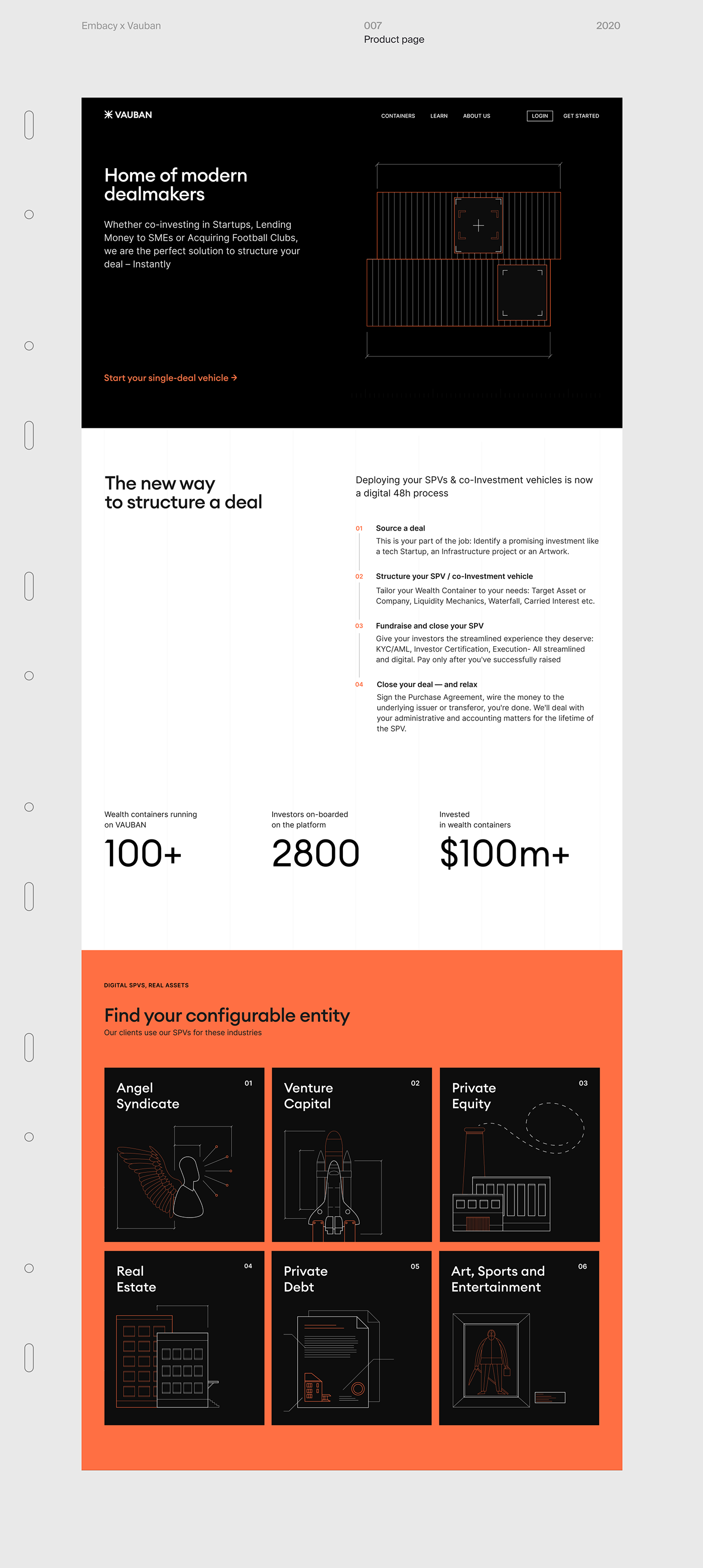 A modern, minimalist website design featuring a stark black and white color scheme with strategic pops of vibrant coral orange. The layout demonstrates sophisticated use of negative space and typography-driven hierarchy, presenting a contemporary digital product or service platform with clean geometric elements and subtle line illustrations.