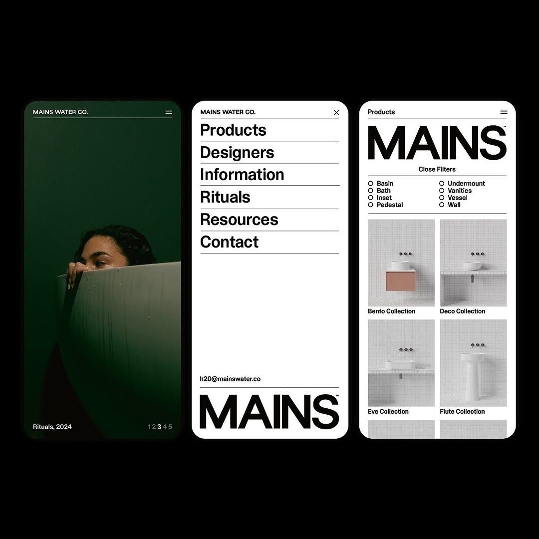 A contemporary digital interface system for Mains Water Co. featuring a minimalist aesthetic with clean typography and modular card layouts. The design employs a sophisticated color palette of deep forest green, crisp white, and warm terracotta accents, creating a premium and professional brand presence across multiple screen states.