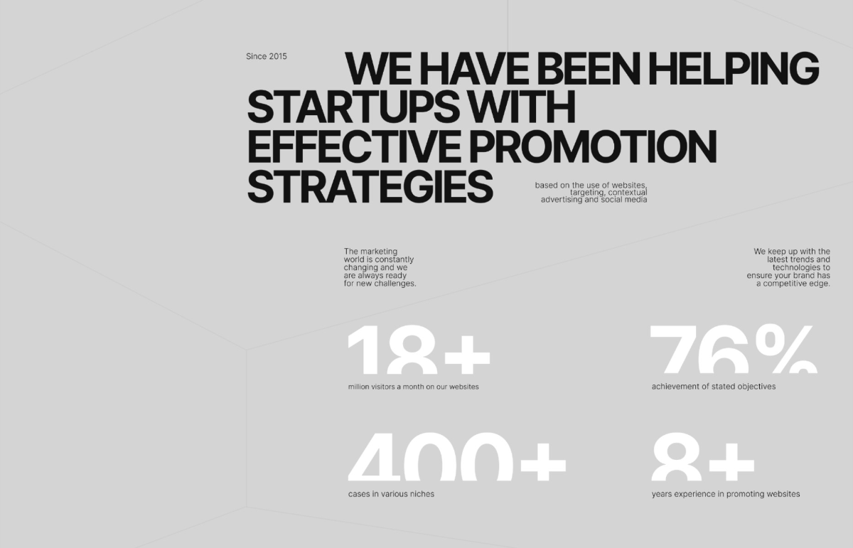 This slide features a clean, professional design utilizing ample white space and strong typography to convey expertise. The visual language is minimalist and modern, emphasizing trust and quantifiable results through clear metrics.