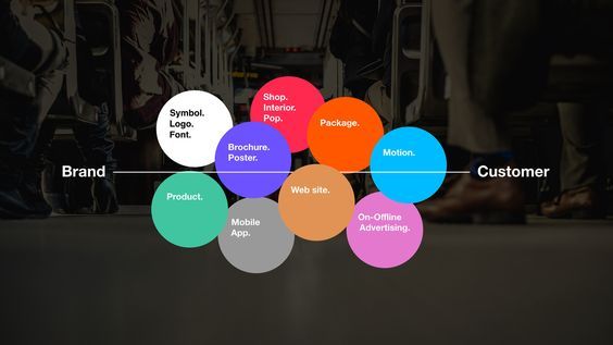 This image presents a conceptual mind map or ecosystem diagram illustrating the relationship between a 'Brand' and a 'Customer' through various touchpoints. The design uses a clean, modern, and somewhat abstract visual language with distinct, brightly colored circles to represent different marketing or product elements.