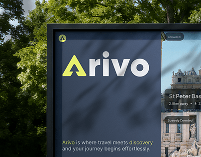 The design utilizes a clean, minimalist aesthetic with high contrast between deep navy tones and vibrant yellow accents. The composition effectively balances large typography with contextual imagery, creating a sophisticated and inviting visual hierarchy for a travel service.