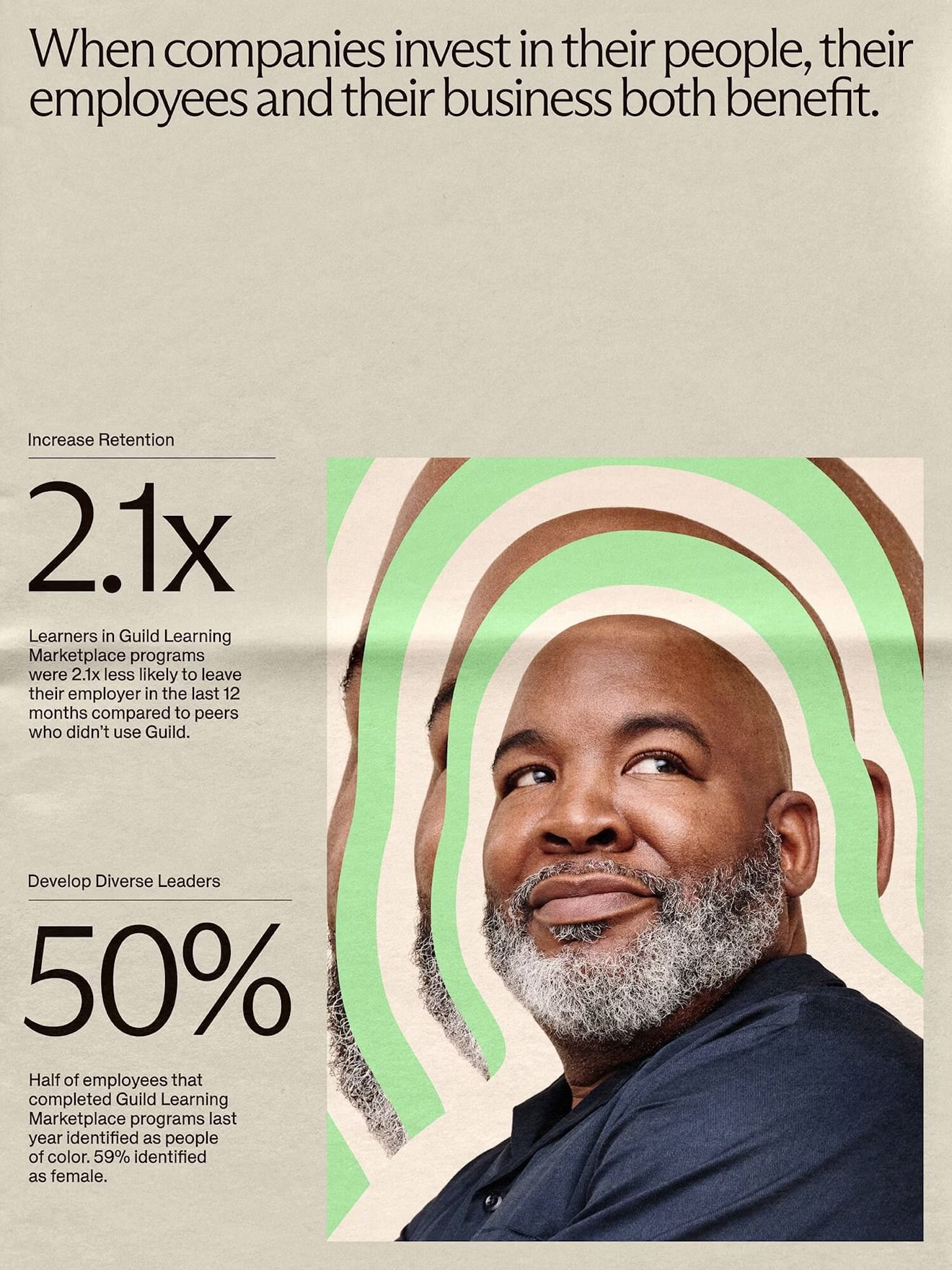This is a clean, modern infographic design that effectively blends professional photography with abstract geometric patterns to present data. The visual language is structured and trustworthy, using muted earth tones and clear typography to communicate complex metrics related to employee development and retention.