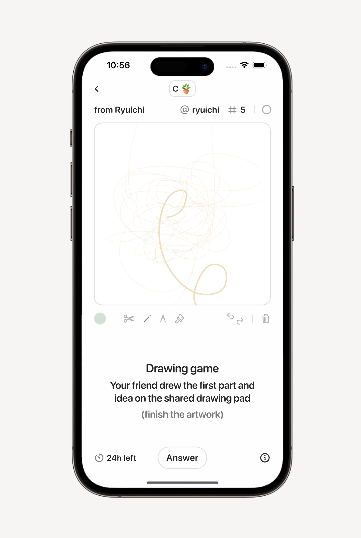 This interface demonstrates a highly minimalist and clean design focused on creative collaboration, using ample white space to highlight the user-generated content. The visual language is calm and functional, prioritizing the drawing area while ensuring clear navigation through subtle typography and standard UI elements.
