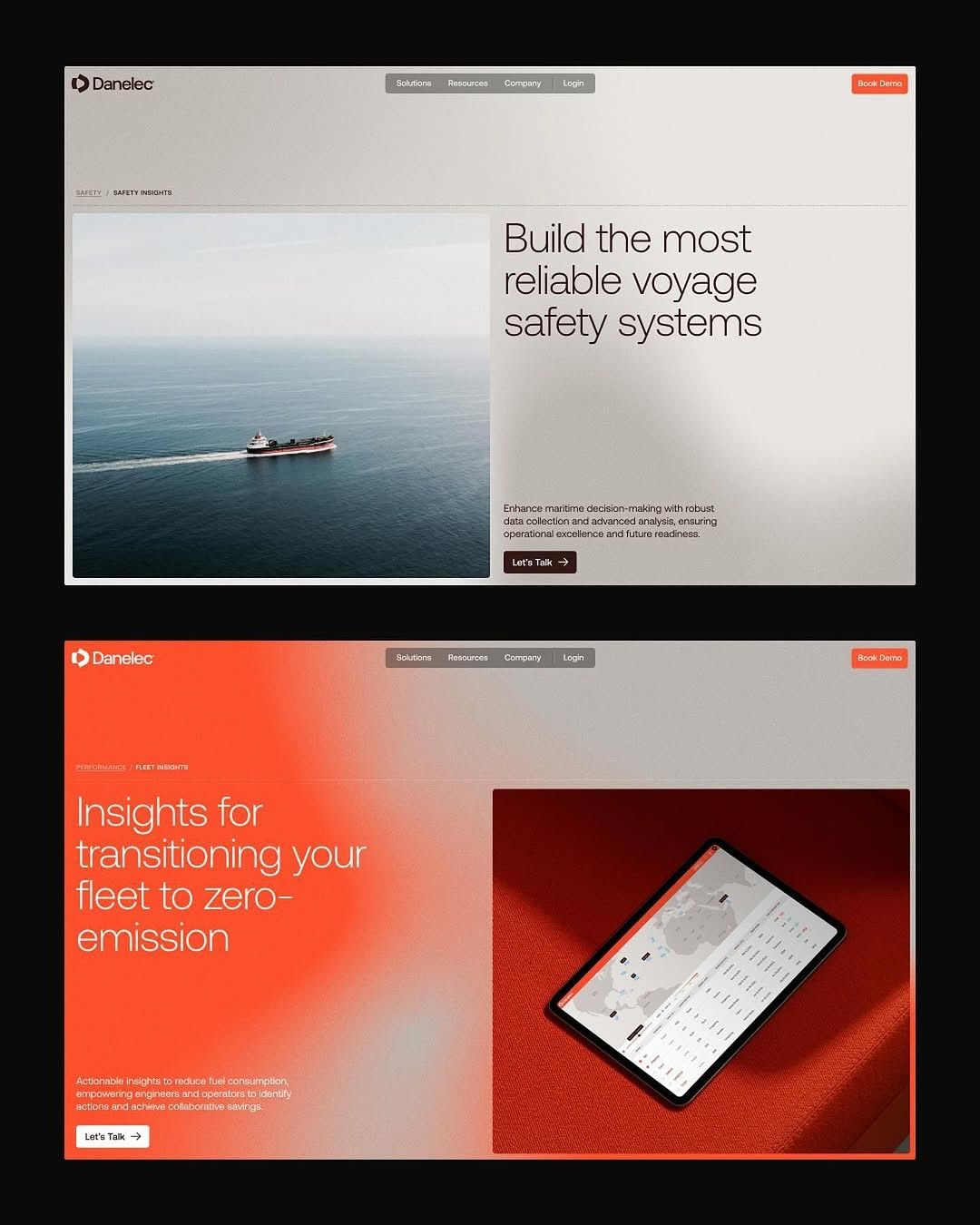 A modern B2B website design featuring two distinct hero sections with minimalist layouts and high-quality imagery. The design employs a sophisticated color-blocking approach with clean typography and ample whitespace, conveying professionalism and innovation in maritime/industrial technology.